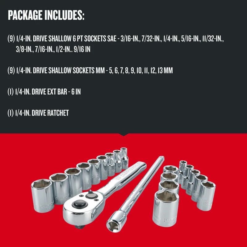 Craftsman 20 pc. 1/4-in. Drive 6 Point Mechanics Tool Set comes equipped with a 72-Tooth ratchet, a broad assortment of drive tools, and a compact storage case. This set is perfect for automotive repair, general construction, and DIY repairs.