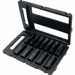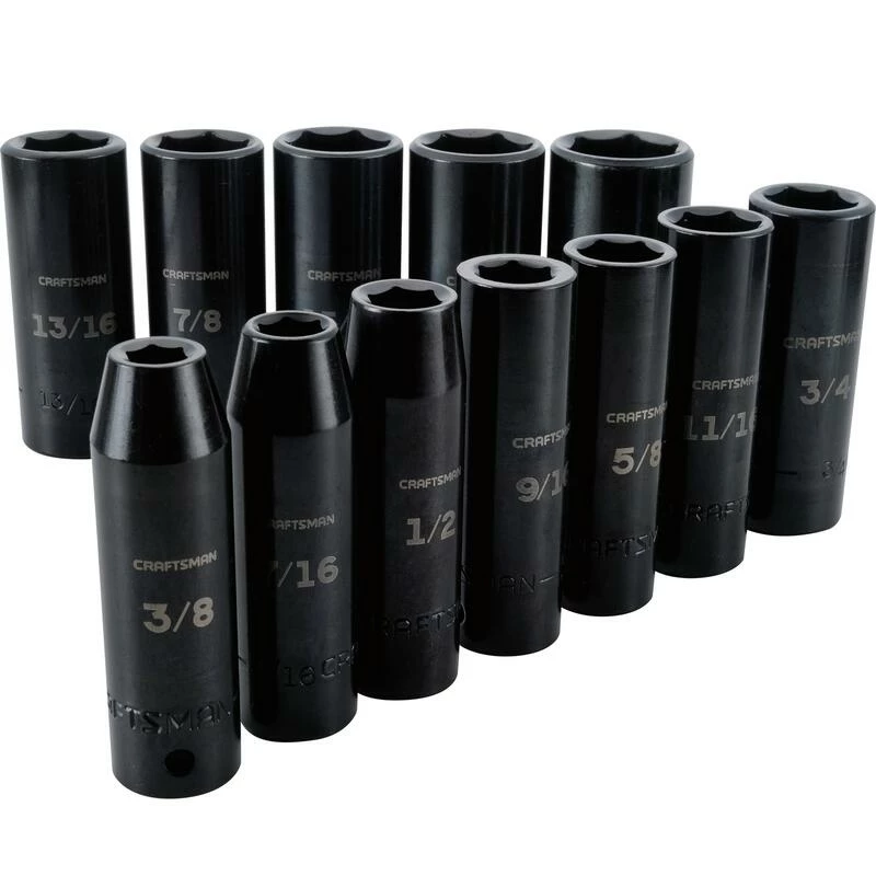 12 pc. SAE Impact Deep Socket Set is engineered and constructed to endure high torque application with impact wrenches. These impact socket are specially designed to engage with the flats of fasteners to prevent rounding so itโs time to turn up the torque and turn tough jobs into easy ones.