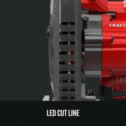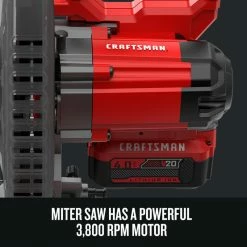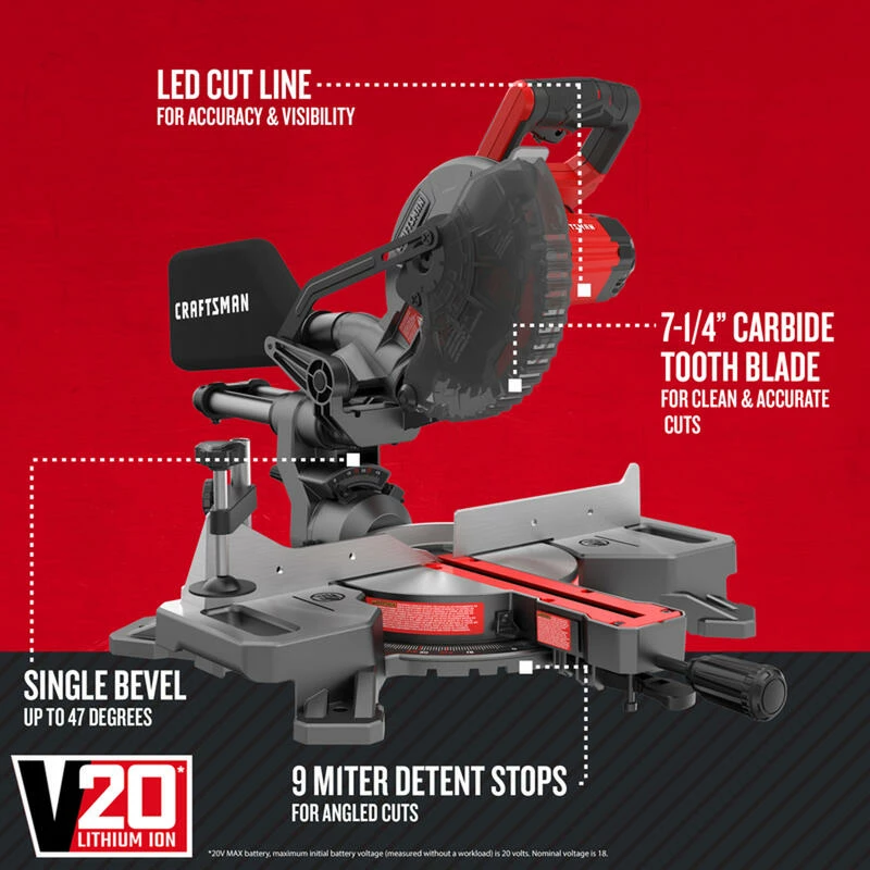This Craftsman V20 Cordless 7-1/4-in. The sliding 7-1/4-in. blade allows for a cross cut capacity of up to 8-in. while the 9 miter detents and single bevel blade allow for angled cuts. The LED light eliminates shadows and provides an accurate easy cut line to follow. Single charge – makes up to 585 cuts in 3-1/4-in. MDF baseboard on a single charge.