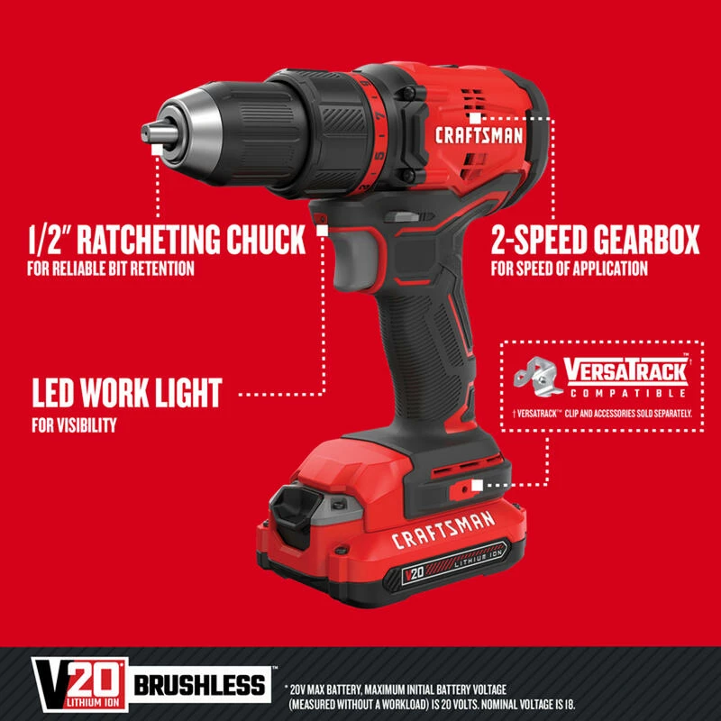 V20 Cordless Brushless 1/2-in. Drill/Driver (1 Battery) is ready for your drilling and fastening needs featuring a brushless motor providing you with up to 25% more runtime and improved durability. Need to work in a dark area, we have you covered. The Drill/Driver offers an LED light to help improve visibility in dark work area.