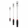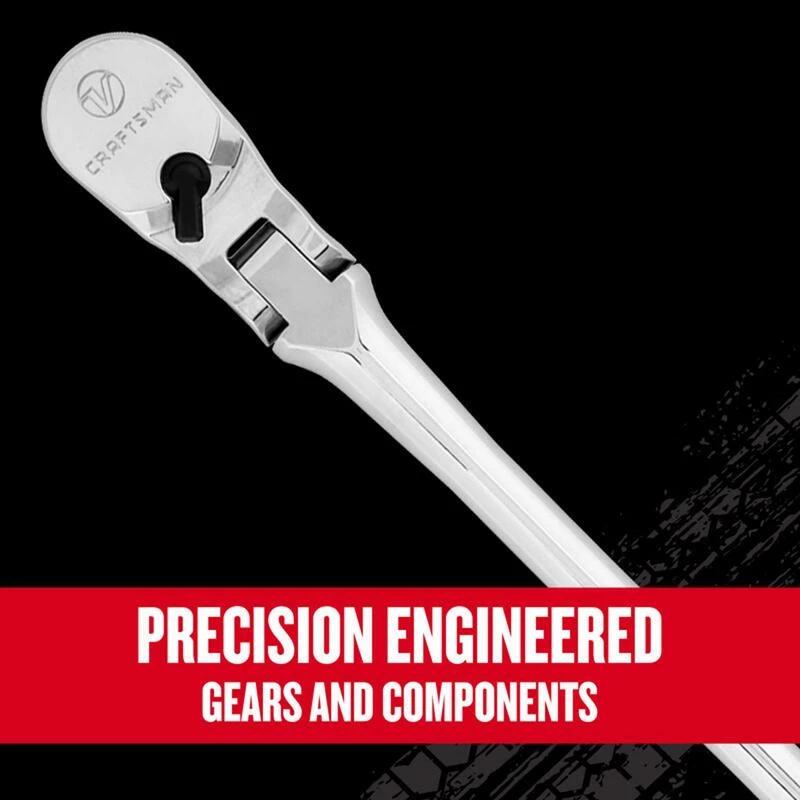 Be ready to take on any project with these V-Seriesโข 1/4 in., 3/8 in., and 1/2 in. Drive Long Flex Head Ratchets. These ratchets were built for professional-grade performance with a 180ยฐ articulating head for greater access to hard-to-reach fasteners compared to standard ratchets. Long life, strength, and durability are delivered by precision-engineered gears and working in confined spaces is made easy with compressed arc swings and optimized grips for strength at any angle.