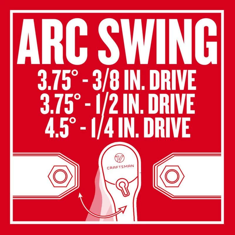 - ACCESS CONFINED SPACES: 4-1/2° on 1/4 in. Drive and 3/8 in. Drive, 3-3/4° arc swing on 1/2 in. Drive