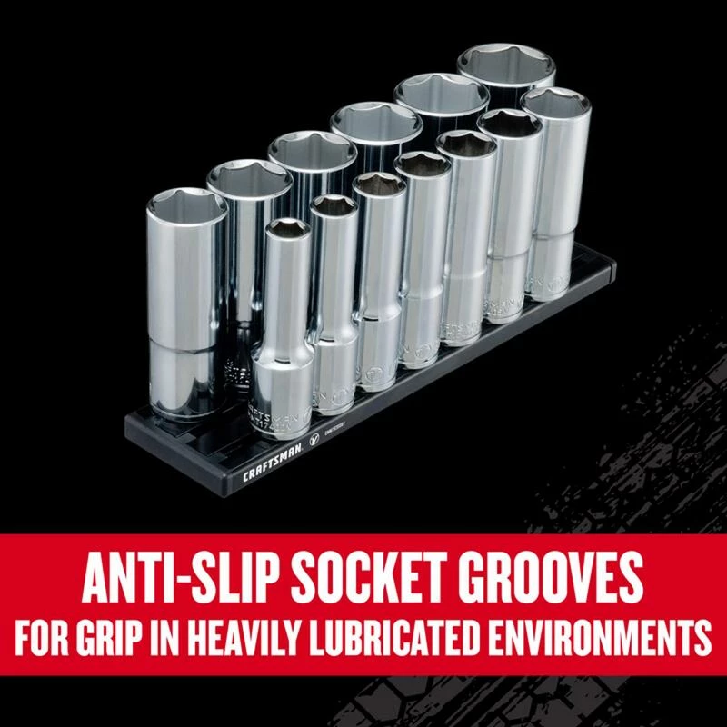 Take the quality of your equipment up a notch with the high-performance V-Seriesโข 1/2 in. Drive SAE Deep 6-Point Socket Set (13 pc.). This set was engineered to optimize the professionalโs productivity, with a magnetic socket rail for easy socket storage and organization plus 6-point socket geometry that maximizes torque onto the flats of fasteners with an off-corner design. Quick socket-to-fastener engagement is made possible by a chamfered and tapered tip design that helps you tackle demanding projects.