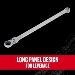 High-grade performance is at your fingertips with the V-Series XXL Metric Ratcheting Single Flex Head Double Box End Wrench. The 72-tooth design on one box end provides a quick and durable ratcheting solution for professionals on the job. The other end features a 6-point extended box end, which provides better access to and engagement of fasteners in recessed positions. The extra-long handleโs lightweight, I-beam design adds control while maintaining strength. The vertical wrench rack is designed to fit into most metal storage drawers, providing users with an organized place to store their wrenches.