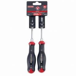 The Craftsman® V-Series 2pc Screwdriver Set leverages premium alloy steel and precision machined tips to deliver up to 10x greater durability. The handles are designed with the mechanic in mind blending precision, torque and control, with a soft touch material that offers comfort and verified 2x protection against the most common garage solvents. Each screwdriver includes a wide bolster with ample space to grip and wrench when additional torque is required.