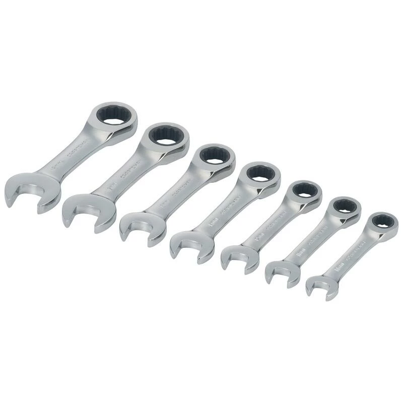 The Craftsman 7 pc. Metric Stubby Ratcheting Combination Wrench Set offers a number of applications from standard bolt turning to specific automotive repairs.