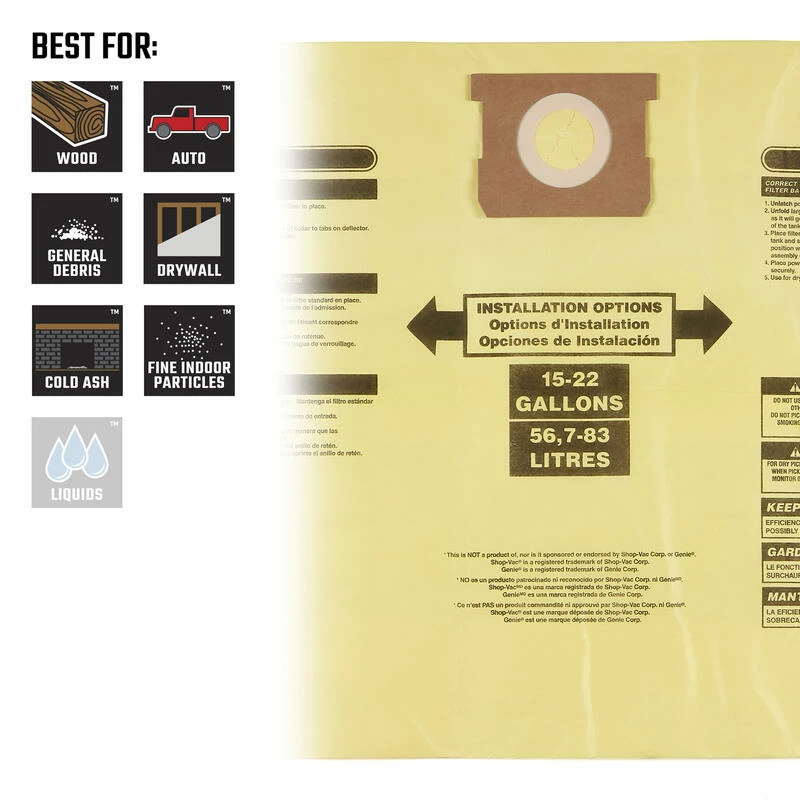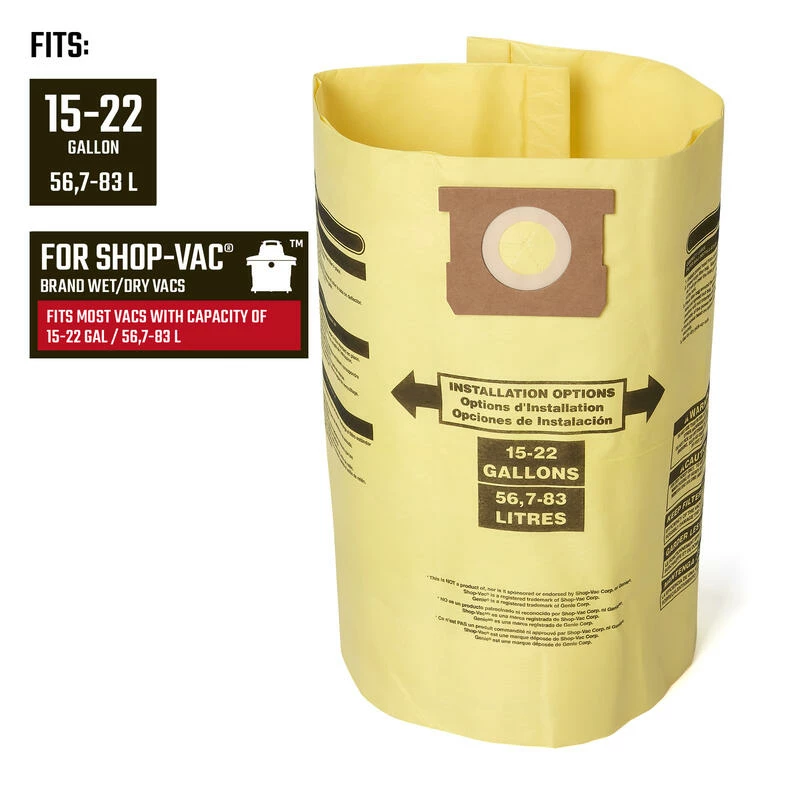 The Craftsman 15 to 22 gallon Fine Dust/Drywall Dust collection bags for wet/dry vacs are designed for pick-up of drywall dust, cold ashes, ultra-fine particles and other dry debris pick-up. These filter bags fit most 15-22 gallon Shop Vac brand vacs. Trap debris conveniently with these dust collection bags for easy disposal. Bags are easy to install by attaching to vacuum port inside tank without needing tools and are even easier to toss away.