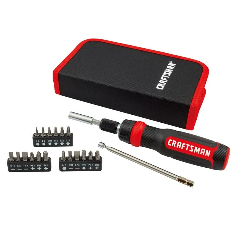 CRAFTSMAN 26 pc. Multi-Bits Ratcheting Screwdriver has an ergonomic handle offering twisting force for three different applications—a speed zone for quick rotation, a torque zone for added grip in heavy-torque applications, and a precision tactile zone for tasks requiring more rotation control. A chrome-plated bar resists corrosion.