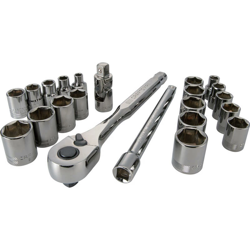 Craftsman 22 pc. Gunmetal 3/8-in. Drive Set comes equipped with a 120-Tooth ratchet and a broad assortment of sockets. This set is perfect for automotive repair, general construction, and DIY repairs.