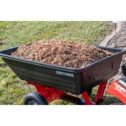 The CMXGZBF7124489 10-cu ft poly cart allows you to use your lawn tractor or ATV to easily transport rock, dirt, mulch and other landscaping materials. Emptying your cart is effortless with the foot pedal dump release and 40 degree dump angle.