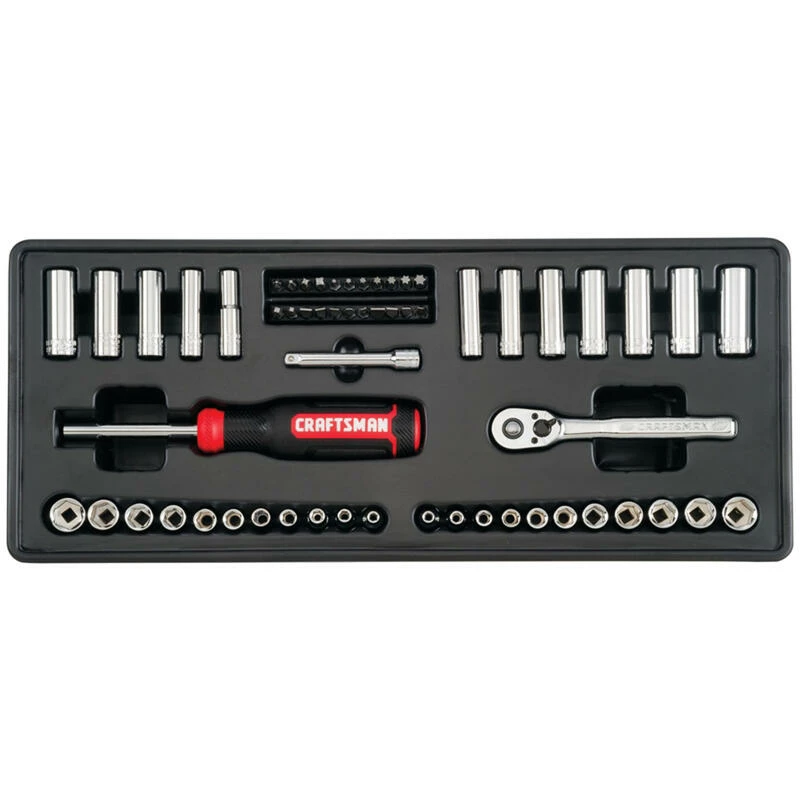 The 104 pc. Mechanic Tool Set is a comprehensive 1/4 in. and 3/8 in. drive mechanic tool set that is packed into Craftsman’s Portable Tool Box with 20.5 in. ball-bearing drawers. An ideal set to incorporate into an existing arsenal of tools or a great starter set. This set features Craftsman’s 72 Tooth 1/4 in. and 3/8 in. Drive Quick Release Ratchets (CMMT81747 & CMMT81748) which provide users with an ideal balance between durability and accessibility.
