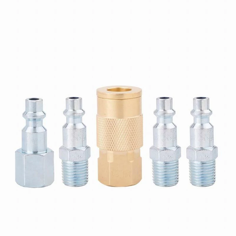 Made from high-quality materials, this industrial connection kit includes four steel male plugs and one female brass coupler.